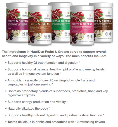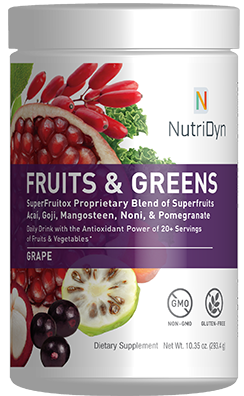 NutriDyn Fruits & Greens is an easy-to-mix, great tasting, nutrient-rich superfood formula with whole food concentrates designed to provide synergistic phytonutrient nutrition. It provides a super blend of 100% natural fruit and vegetable extracts, vitamins, enzymes, and symbiotic intestinalflora— high in antioxidants, lignans, and phytonutrients.◆ This blend supports the body’s natural energy, metabolism, fat-burning, digestion, detoxification, immunity, repair, recovery, revitalization, and longevity.◆