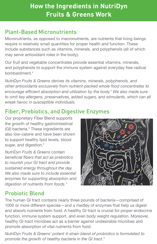 NutriDyn Fruits & Greens is an easy-to-mix, great tasting, nutrient-rich superfood formula with whole food concentrates designed to provide synergistic phytonutrient nutrition. It provides a super blend of 100% natural fruit and vegetable extracts, vitamins, enzymes, and symbiotic intestinalflora— high in antioxidants, lignans, and phytonutrients.◆ This blend supports the body’s natural energy, metabolism, fat-burning, digestion, detoxification, immunity, repair, recovery, revitalization, and longevity.◆