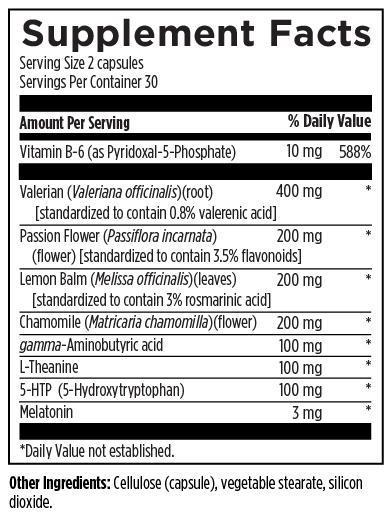 Key ingredients include botanicals that support nervous system function, PharmaGABA® (a proprietary form of GABA), L-theanine, melatonin, 5-HTP, and pyridoxal-5-phospate (activated form of vitamin B6).